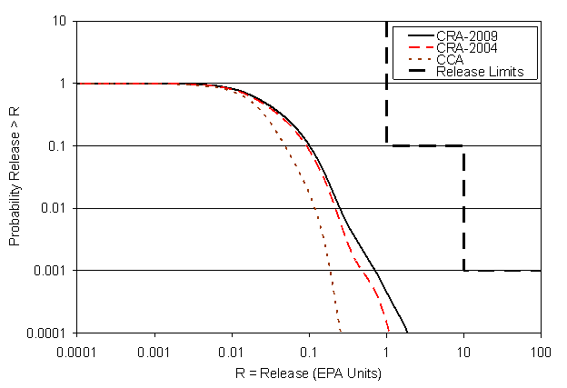 The results of the CRA-2009 PA demonstrate that the repository continues to comply with the disposal standards. The results demonstrate a greater-than-95% level of statistical confidence that the overall mean of the population of complementary cumulative distribution functions (CCDFs) is in compliance with the containment requirements of 40 CFR § 191.13. The overall mean CCDFs of the CCA, CRA-2004, and CRA-2009 are shown in Figure EXECSUM-1 and illustrate the wide margin of compliance of the predicted releases with respect to the release limits.
