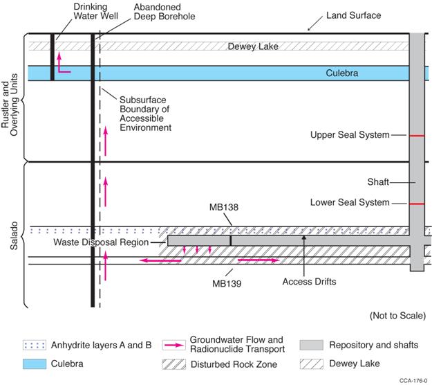 Section 194.52 specifies that compliance assessments shall consider “all potential pathways from the disposal system to individuals.” The DOE has considered the following potential pathways for groundwater flow and radionuclide transport: