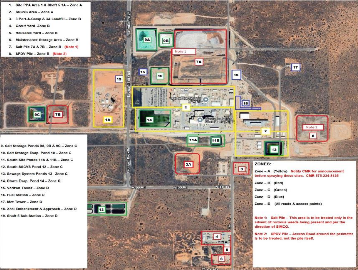 Zone B consists of salt cells and SPDV material pile. These assets will be treated only per the direction of SIMCO, primarily for noxious weeds and weed maintenance of access roads. This zone also includes off-site storage areas. These assets will receive a monthly spot treatment and a spring and fall Broadcast Treatment as identified above. Included in this description are the laydown yards for Sandia National Laboratories, Environmental property, and the landfill area inside and outside the fence lines.